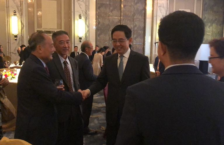当晚7时许,当洪小勇大使阁下伉俪步入宴会厅时,受到了与会来宾的热烈欢迎。大使与在场嘉宾逐一握手致意,拉开的当天晚宴的序幕。