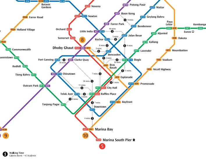 这样一来,跨线交通就更方便了,新加坡有18对地铁站之间的距离15分钟内就可以走到。