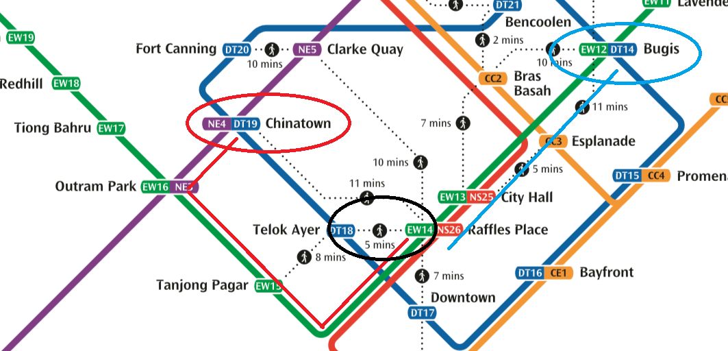 比如我红线坐到莱佛士站要转到蓝线的站点,以前,我要转绿线坐很长的两站到武吉士站再转蓝线(图中蓝色线路),或者转绿线坐到欧南园站再转紫线到牛车水站换乘蓝线(图中红色线路),十分的复杂有木有!