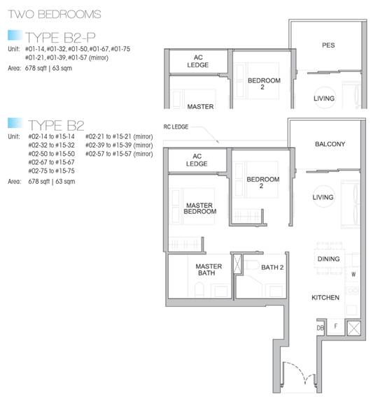 二卧室,套内面积57平方米(614平方尺)至67平方米(1044平方尺)。平均售价约1,432元/平方尺,整套售价从97.8万元起。特点是户型大门入口有小玄关,再往里是厨房与餐厅。客厅配备一个较大的阳台。无论客厅、厨房、餐厅、房间均方方正正,布局合理,无浪费空间,两个房间均可放置双人床。这样的户型非常适合夫妻情侣享受二人世界,也很适合有个小孩的夫妻。除了自住,也适合出租给高端专业人士。