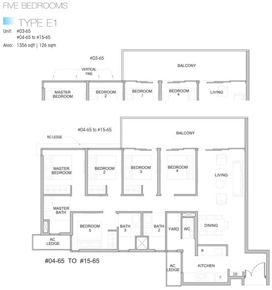 五卧室,套内面积121平方米(1302平方尺)。平均售价约1,385元/平方尺,整套售价从192万元起。与大部分户型相似,大门入口有大玄关,入口与厨房餐厅等完全隔开,从大门入口处完全看不到室内空间。与四卧室相似,入门后往左转是完全独立的厨房。从厨房走出来就是餐厅,而餐厅与客厅由过道自然分开,朝过道往前走就是五个房间。其中两个普通房与客厅共享一个较大的阳台。与所有房型一样,无论客厅、厨房、餐厅、房间均方方正正,布局合理,无浪费空间,所有房间均可放置双人床,且配备内置衣柜。这样的户型非常适合有3个或以上小孩的夫妻或与父母同住的家庭,也适合多代同堂的家庭,也适合这类的高端租户。