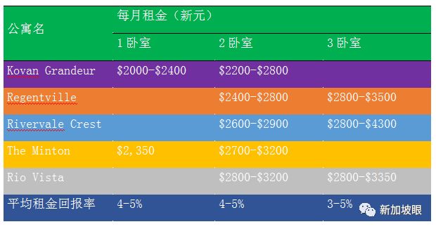 鑫丰银河湾的销售价格相当合理,但其附近公寓的租金回报率却较高。我们分析了附近5栋公寓的出租情况。这5栋公寓分别为Kovan Grandeur、Regentville、Rivervale Crest、The Minton和Rio Vista。它们的月租金1卧室的至少每月新元$1900左右。2卧室的租金每月新元$2200-$3200。而3卧室的为$2800-$3300。月租维持在较高水平。