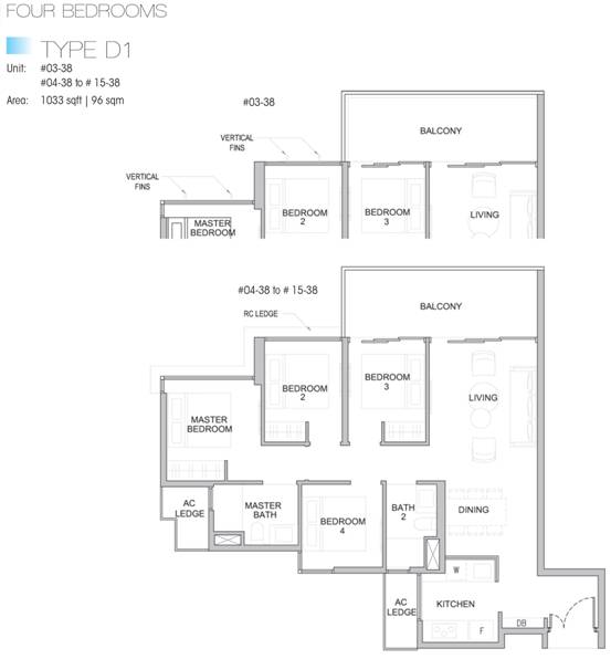 四卧室,套内面积96平方米(1033平方尺)至113平方米(1216平方尺)。平均售价约1,366元/平方尺,整套售价从1,415,210元起。户型大门入口有大玄关,入口与厨房餐厅等完全隔开,从大门入口处完全看不到室内空间。入门后往左转是完全独立的厨房。从厨房走出来就是餐厅,而餐厅与客厅由过道自然分开,朝过道往前走就是四个房间。其中一个普通房与客厅共享一个较大的阳台。与所有房型一样,无论客厅、厨房、餐厅、房间均方方正正,布局合理,无浪费空间,所有房间均可放置双人床,且配备内置衣柜。这样的户型非常适合有2个或以上小孩的夫妻或与父母同住的家庭,也适合这类的租户。