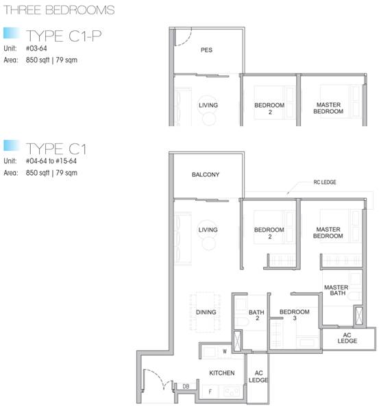 三卧室,套内面积79平方米(850平方尺)至97平方米(721平方尺)。平均售价约1,330元/平方尺,整套售价从113.8万元起。特点是户型大门入口有大玄关,入口与厨房餐厅等完全隔开,从大门入口处完全看不到室内空间。入门后往右转才到厨房。厨房与餐厅由吧台隔开,而餐厅与客厅由过道自然分开,客厅配备一个较大的阳台。与三卧室相似,无论客厅、厨房、餐厅、房间均方方正正,布局合理,无浪费空间,所有房间均可放置双人床,且配备内置衣柜。这样的户型非常适合有1-2个小孩的夫妻。除了自住,也适合出租给有家庭的中高端专业人士。