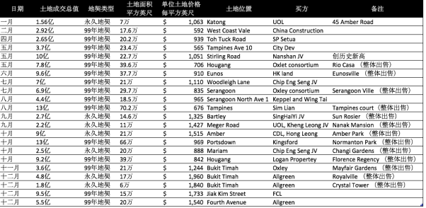同样的故事也发生在新加坡的各个区域,下面的表格是2017年一些重要的土地成交记录,数据来源URA。