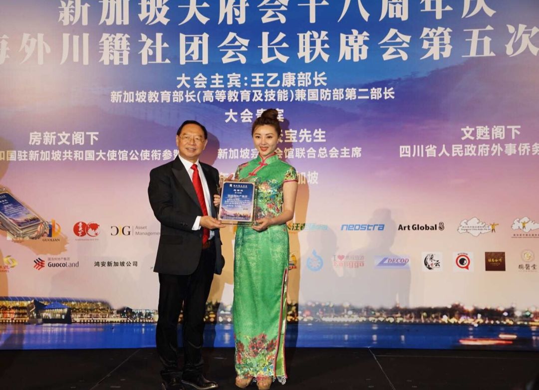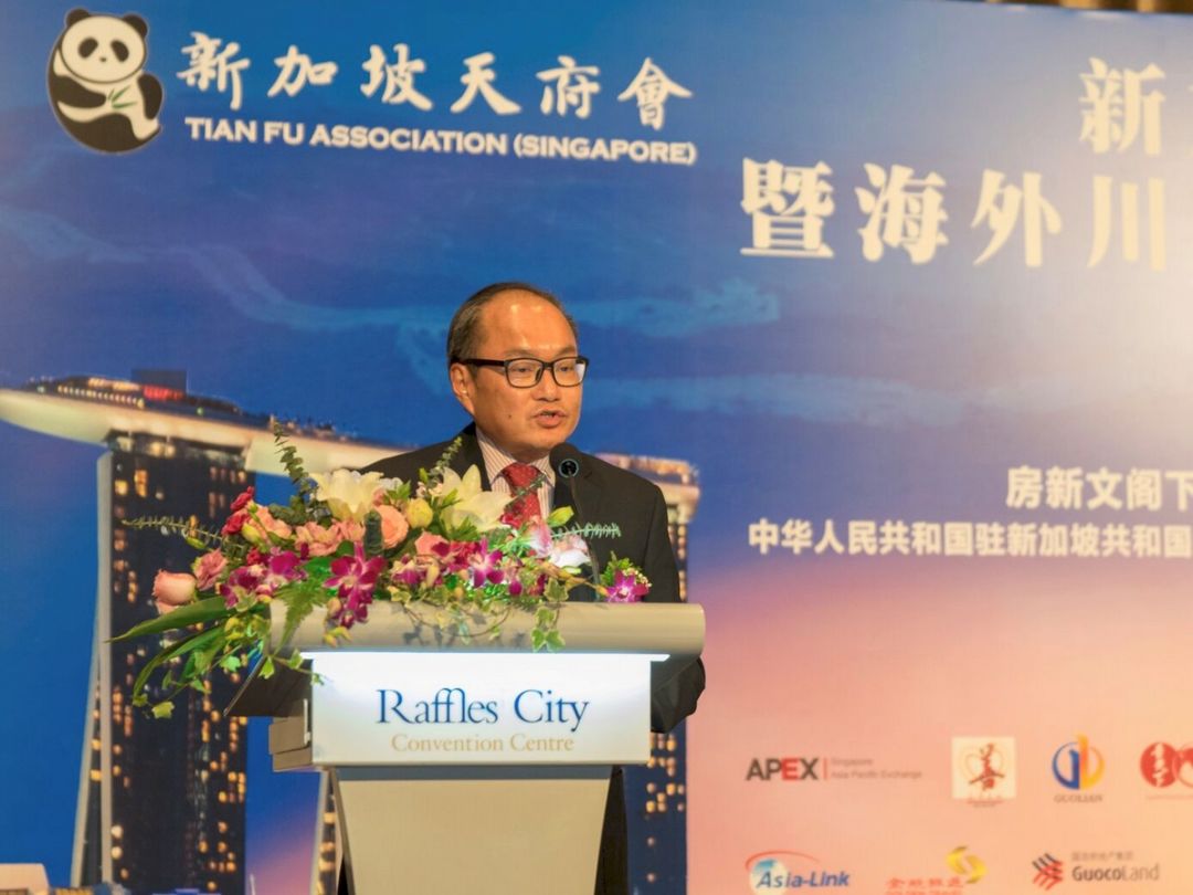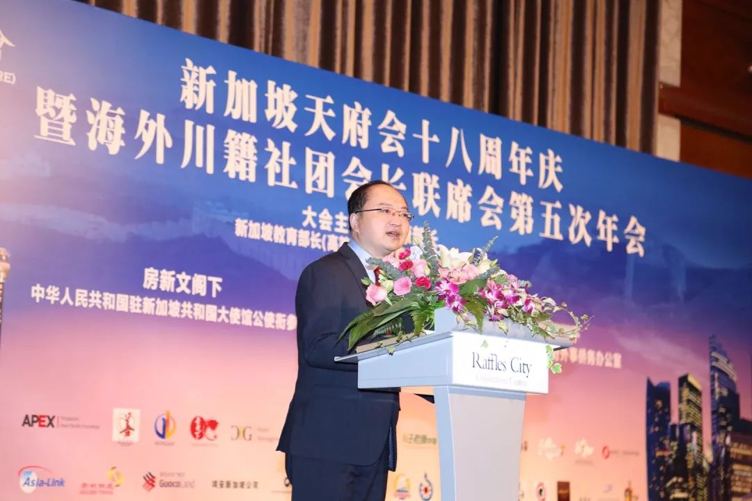 紧接着,庆典大会邀请的贵宾,中国驻新加坡大使馆房新文公参发表祝贺词,真诚祝福天府会越来越壮大。
