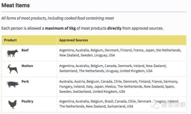 最多携带5公斤的肉类,但必须是来自官方批准进口的国家/地区。注意!下图中可进口肉类的国家名单中没有中国,所以,从中国带任何生或熟的肉入境都是违法的!