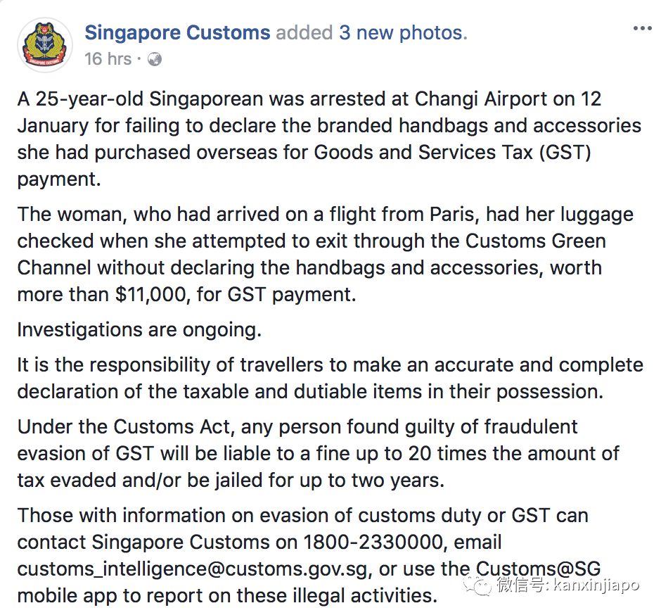(大意是说:一名25岁的新加坡人1月12日在樟宜机场被捕,原因是她未向海关申报在海外购买的免税品牌手袋和配饰。这名女子从巴黎飞抵新加坡,在通过新加坡海关是走的是“无申报”绿色通道,海关拦下她进行检查,发现实际上她所持的物品已超过11,000新元。目前,海关还在调查这起事件。
