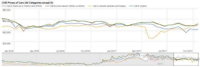 拥车证的价格,就是在市场规律的影响下,一路拉着扯着往前走,在2016年之后逐步趋稳趋低,告诉你几个极值(单位全是新币):