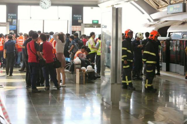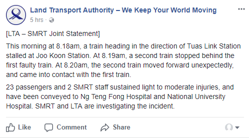 陆路交通管理局(LTA)和SMRT在社交媒体上发出联合公告,指出第一辆往大士站方向的列车停靠在裕群站,第二列列车意外前进,与第一列发生相碰。