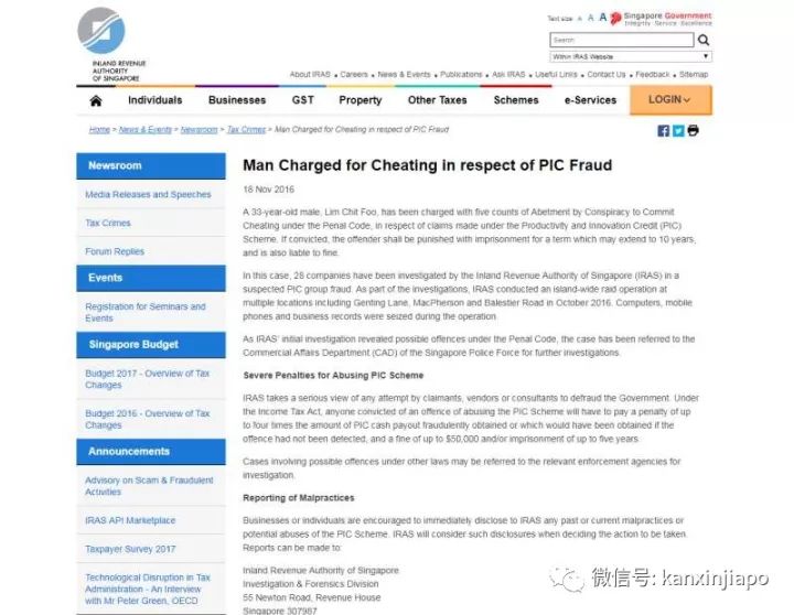▲新加坡税务局网站截图,内容为李腾合伙人涉嫌诈骗津贴