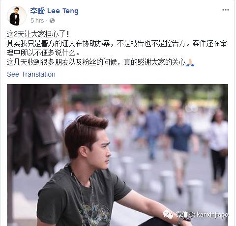 从法庭作证出来后的李腾,今天更新了Facebook状态,Po出一张在大街上闲坐的照片,让朋友和粉丝不必担心。