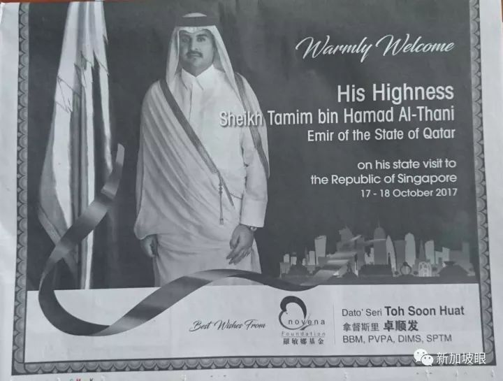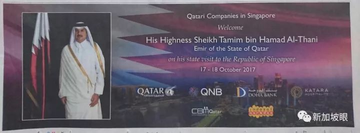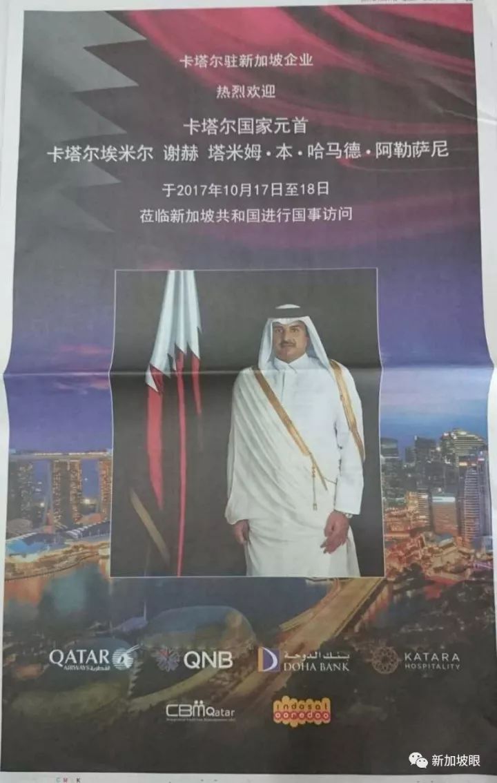 今天翻开新加坡报纸一看,就知道卡塔尔国王访问新加坡!因为,无论是英文的《海峡时报》或华文的《联合早报》,都在显著的位置刊登了欢迎卡塔尔国王塔米姆(Sheikh Tamim Bin Hamad Al Thani)访问新加披的广告!