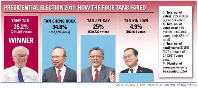 他在2011年新加坡总统大选中,得票率如下: