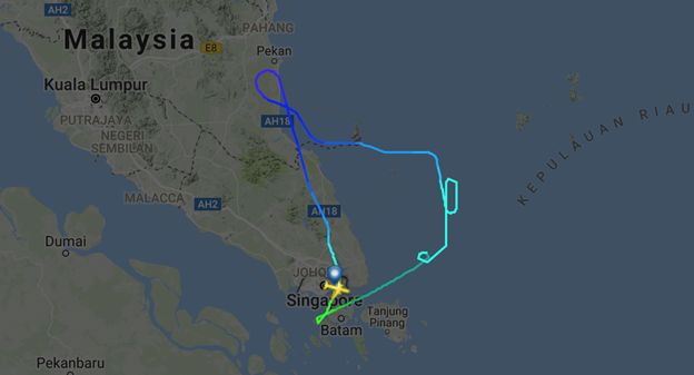 从图中我们可以看到TR634航班不断在南中国海上盘旋、绕圈,飞了将近一个小时,其中一个原因是为了消耗更多燃油,以减少爆炸事故发生时可能造成的危害。