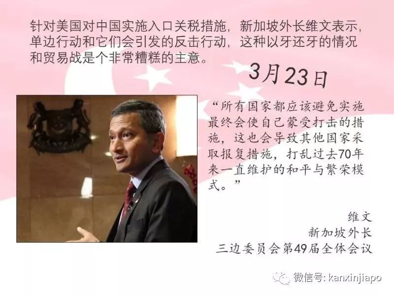 采访中他说道,新加坡是一个小规模的开放型经济体,非常依赖国际贸易。如果一些国家采取贸易保护主义措施,引起相关国家的反制措施,从而导致贸易战,这会严重破坏各国间的贸易体系。
