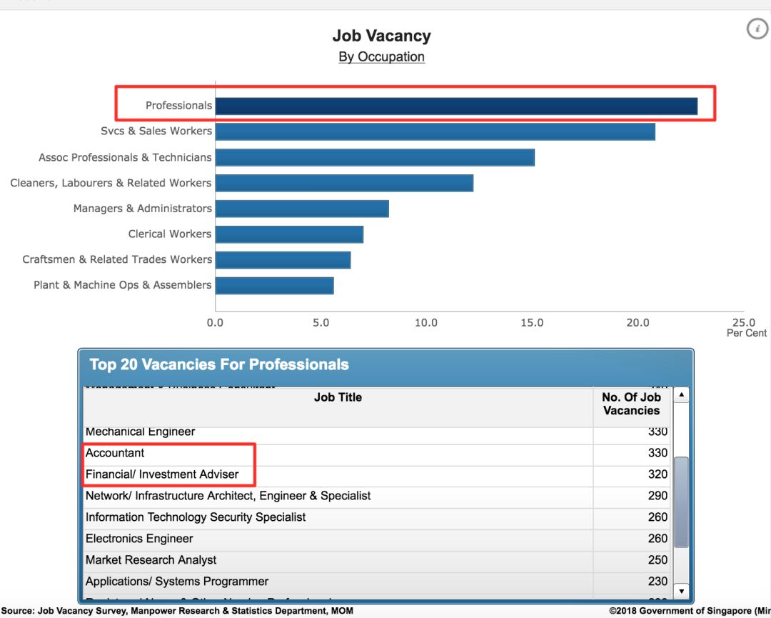 这个问题,我们需要问问MOM新加坡人力局,一份官方最新相关统计显示,2017年,新加坡市场对持有执业资格的Professionals人才的需求占据了整个人才市场的22%,在这个第一梯队中,注册会计师和金融投资顾问排名第9位和第10位,执业人才很紧缺。