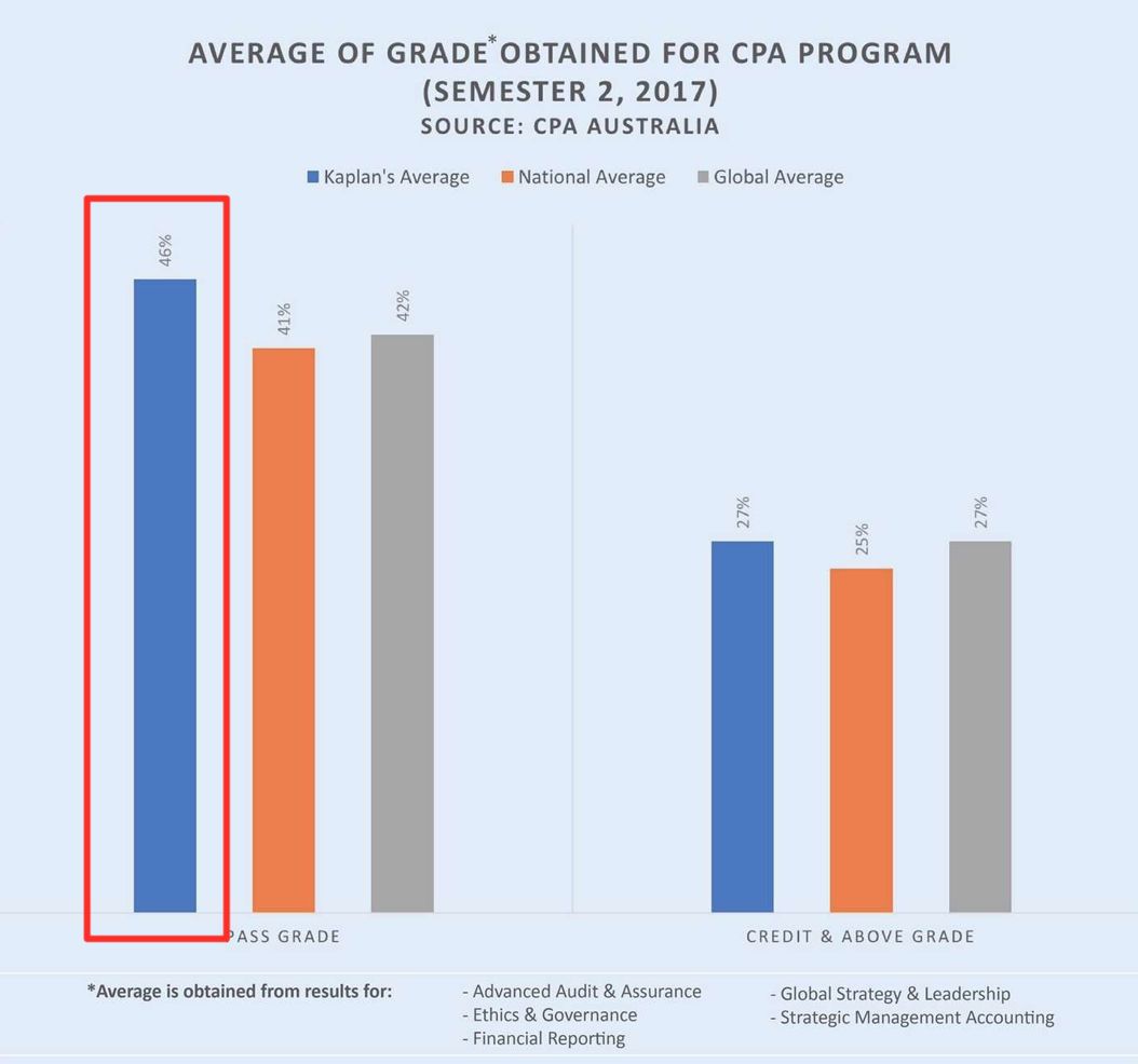 为什么选择Kaplan?● 从2011年开始提供澳洲注册会计师课程(CPA Australia)培训,目前已经培养超过1,500名学员。经验丰富讲师,历届学员成绩优异,通过率高。下图中红线标注出的是Kaplan学生的通过率,远远高于平均水平。