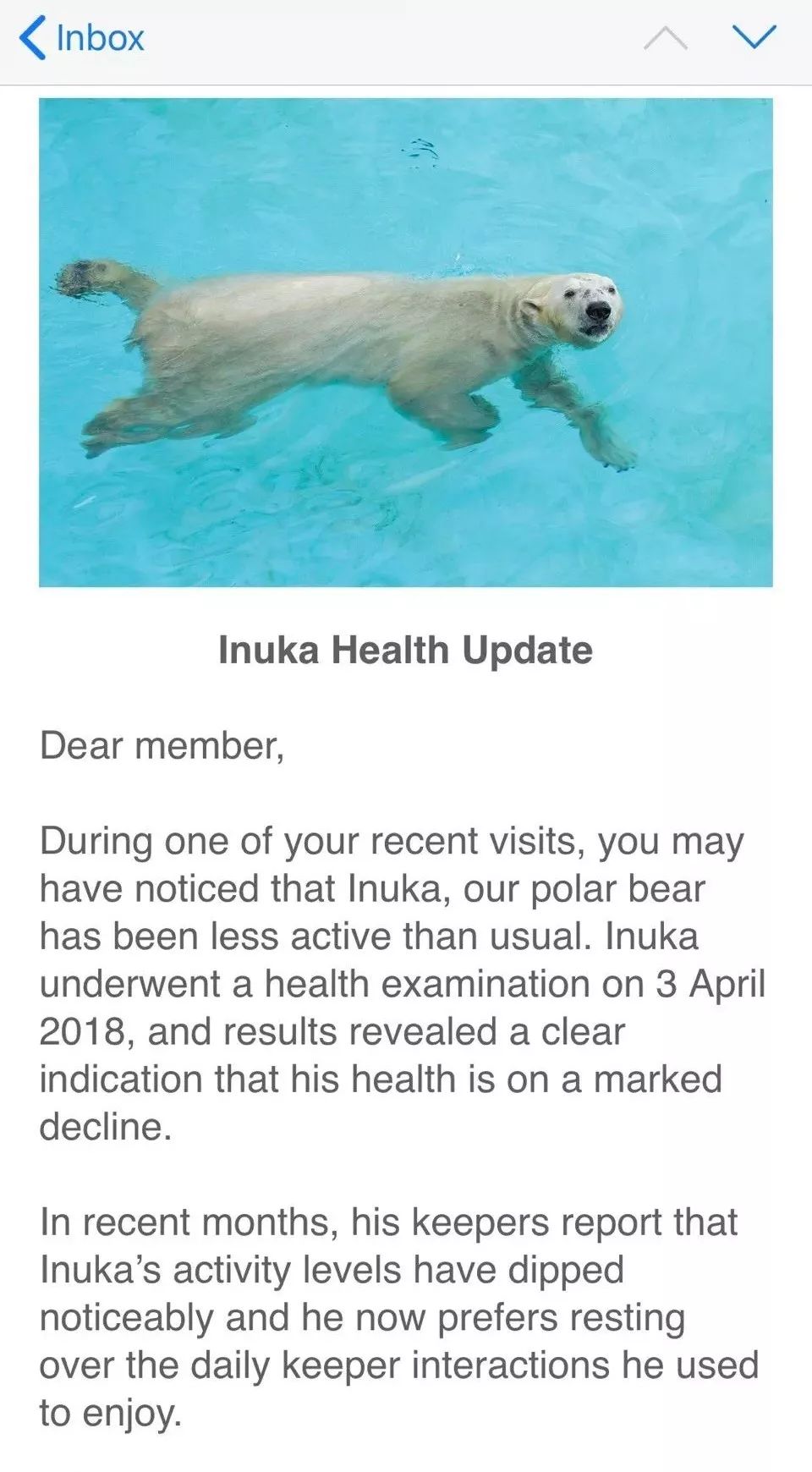 新加坡动物园的会员们,也收到了伊努卡的近况邮件。在过去三个月伊努卡活动量大大减少,就连以往最喜欢做的事都提不起兴趣。