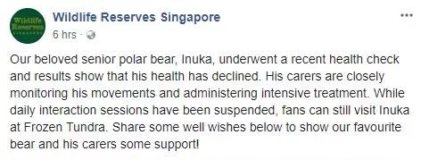 今天,动物园发出公告,伊努卡的身体状况每况愈下,动物园已经暂停了北极熊互动活动,让伊努卡可以安心休养。