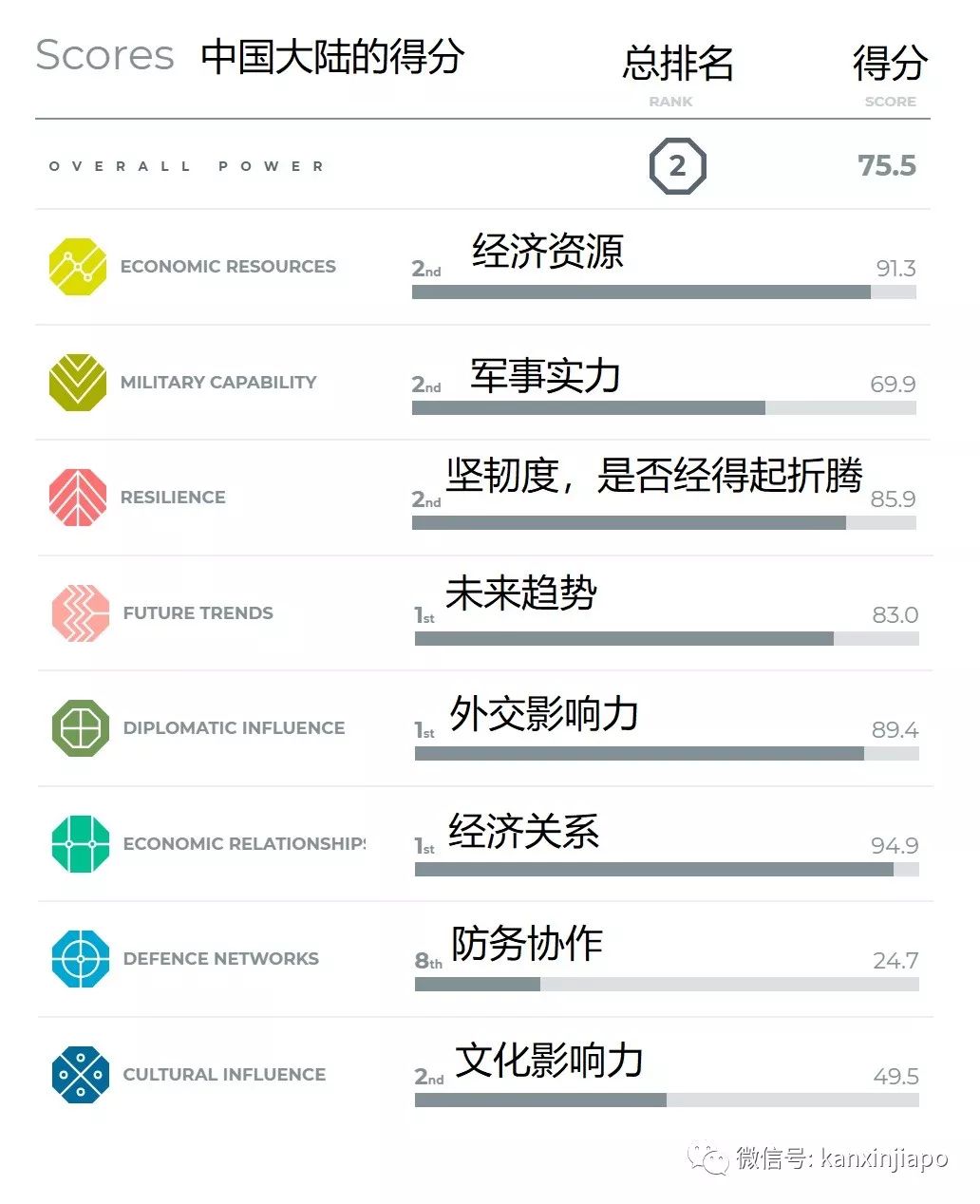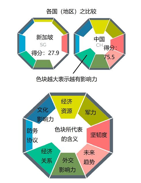 新加坡大多数得分来自外交影响力、经济关系、防务协作,它在几个领域中分别在25个国家和地区中的第8名、第4名和第5名。