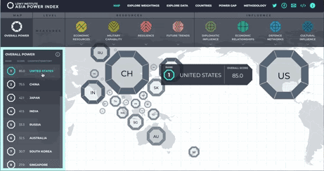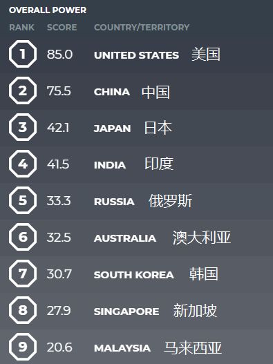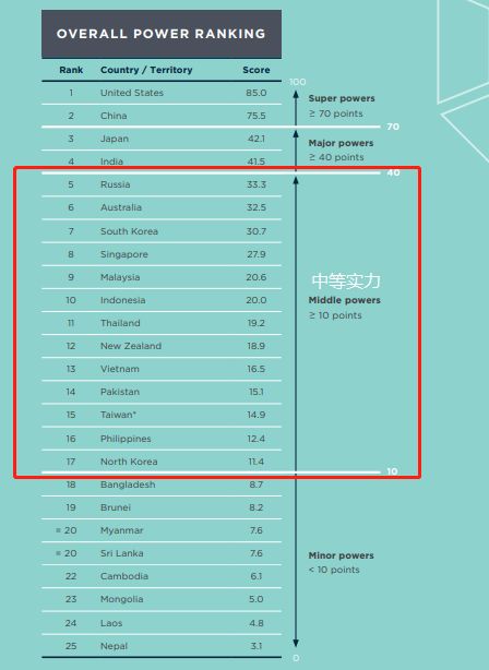 所谓“实力”排名,说白了就是国家与地区在亚洲的影响力。它是由澳大利亚智库(lowy Institute),通过对比25个国家及地区在8个领域的得分,综合排名而来。