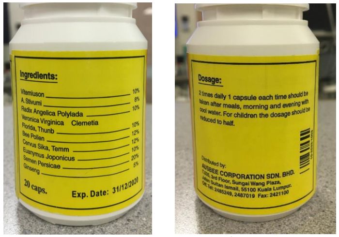 一名70岁的妇女因为想要缓解背痛、增强身体状况,两年来服用AUSBEE AUSTRALIA® AUSBEE Herbal Powder 胶囊。最近她因为骨折动了手术,之后出现急性肾上腺皮质危象(adrenal crisis),导致血压严重下降,被送往加护病房。