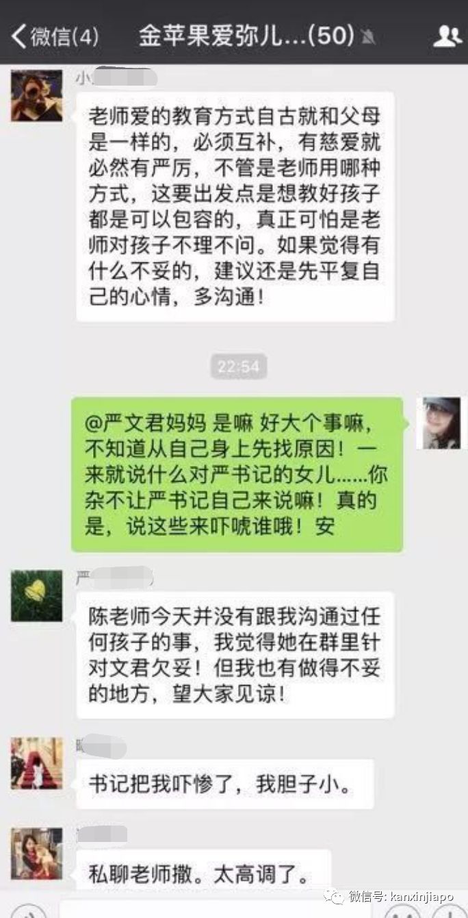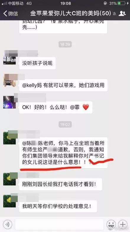 但是家长们并不买账,一致的意见却是:该收拾一下这些人了,必须要给园长说明家长的态度,让严夫人给老师道歉。一个辣妈直接@严夫人说:好大个事嘛,不知道从自己身上先找原因,一来就说什么严书记的女儿,你咋不让严书记自己来说呢,真的是,说这些来吓唬谁呢,安?