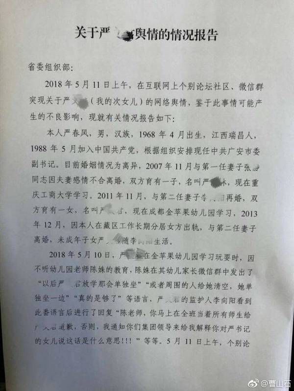 两天后,网上还出现了署名为“广安市委副书记严春风”写给省委组织部的情况说明,称其已与“严夫人”离婚,还特别声明是因为她在严书记援藏期间出轨所致。为了自证清白,严书记也是豁出去了。不过,如此“甩锅”似乎也成了一种套路。