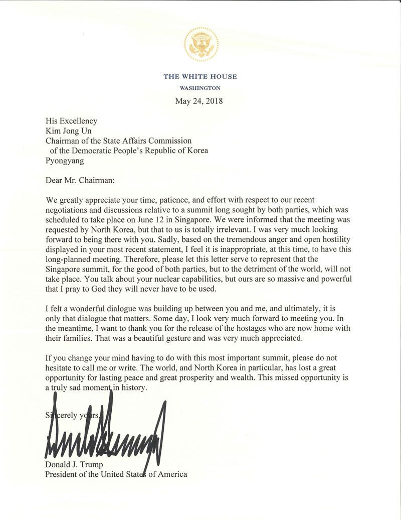 5月24日9点50分左右,美国CNBC报道,美国总统特朗普称,与朝鲜最高领导人金正恩在新加坡的会晤已取消。