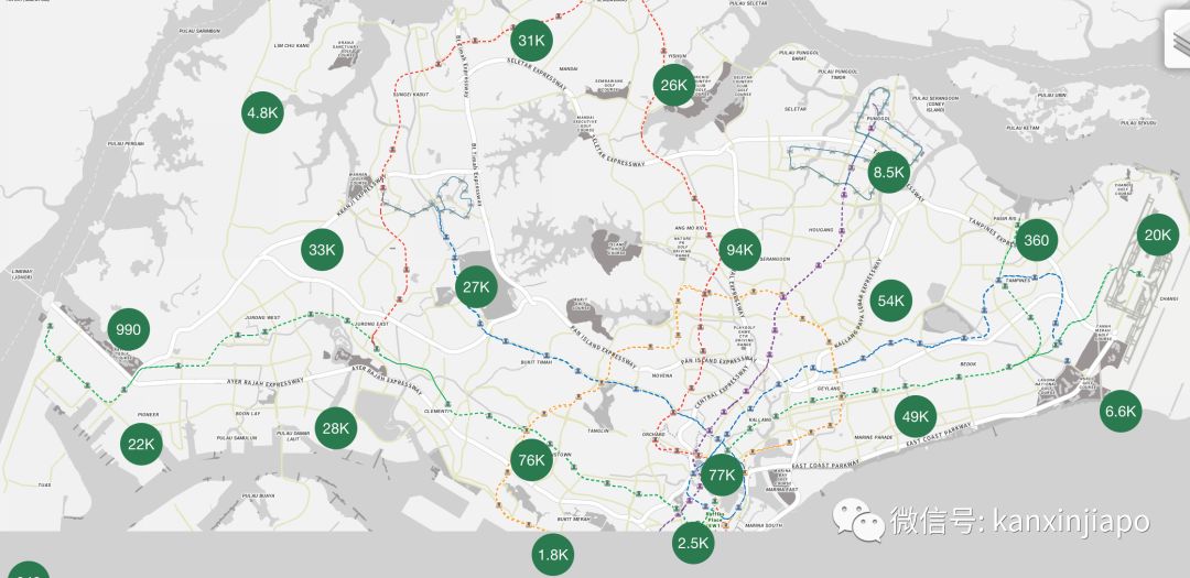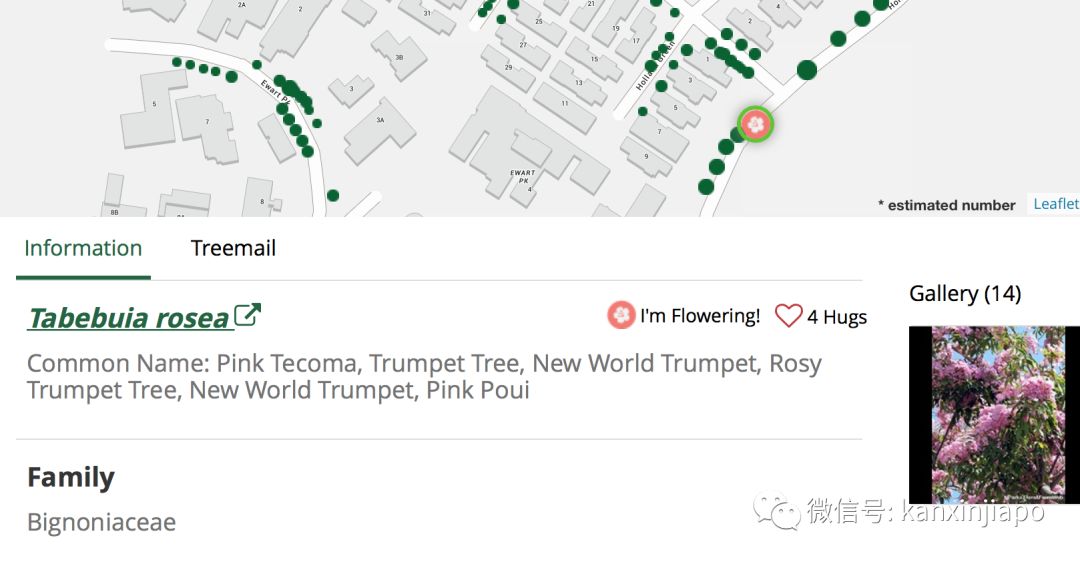 有些标记的圆点是粉色的而非绿色,这是怎么回事呢?原来粉色代表的是会开花的树,可以说非常新加坡式的浪漫啦。(bgm:如何让你遇见我,在我最美丽的时刻……)