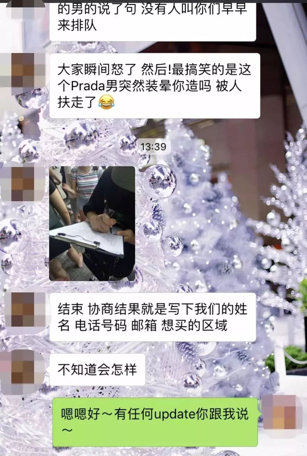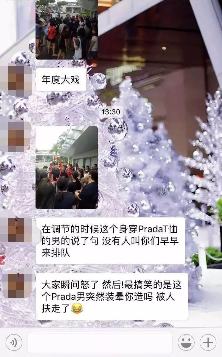 后来警方参与调节,希望能够平息掉群众的怒气。一位身穿prada的疑似工作人员的男士突然对等待的群众说没有人叫你们早早来排队,这句话无疑是火上浇油,让本就处于焦躁生气的群众更加怒火冲天了。