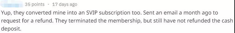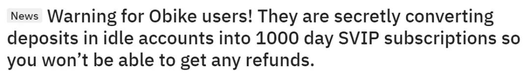 翻译:网友po文,oBike在他不知情的情况下把押金换成超级VIP订阅服务了!然后申请退款,结果oBike终止了他的会员后,依然没有退回押金。