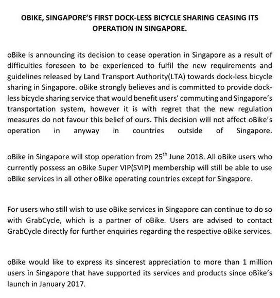 专(五)业(毛)翻译:我们致力于提供共享脚踏车服务,但遗憾的是“新加坡陆路交通局的管理措施不利我们的工作” 所以我们决定从今天开始停止在新加坡的直接运营,这一项决定不会影响新加坡以外的国家。