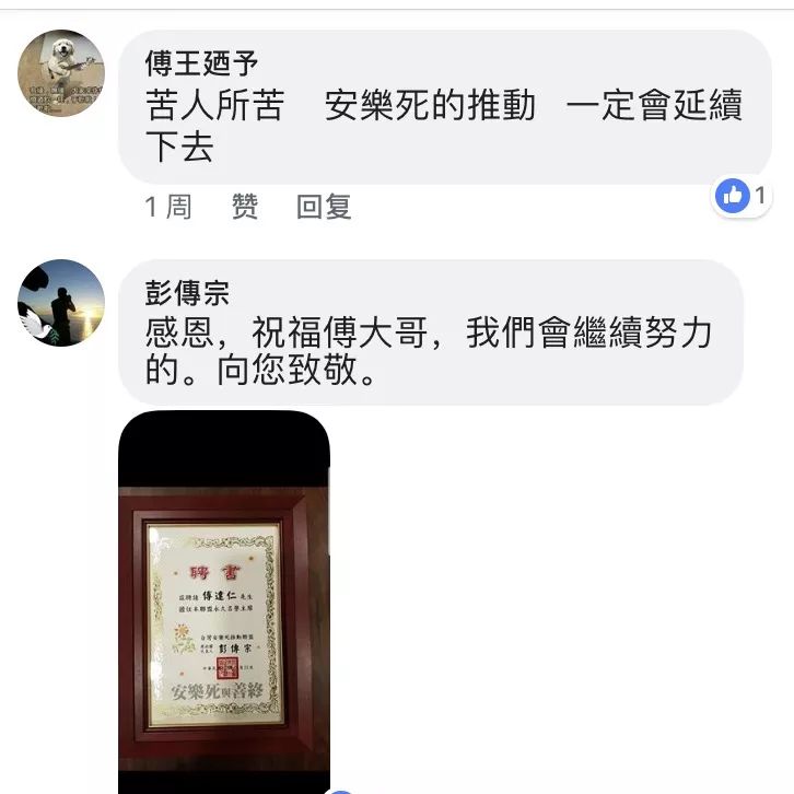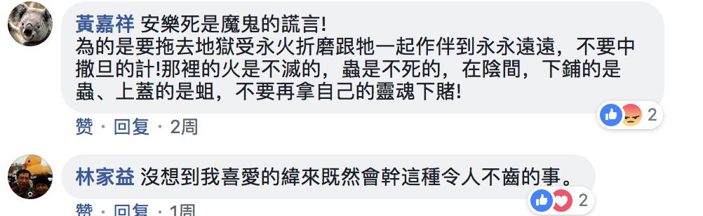 (几乎在傅达仁的每一条facebook下,都能看到这样的评论,愤怒的网友留言:安乐死令人不齿,会被拖去地狱,受永火折磨到永永远远。)