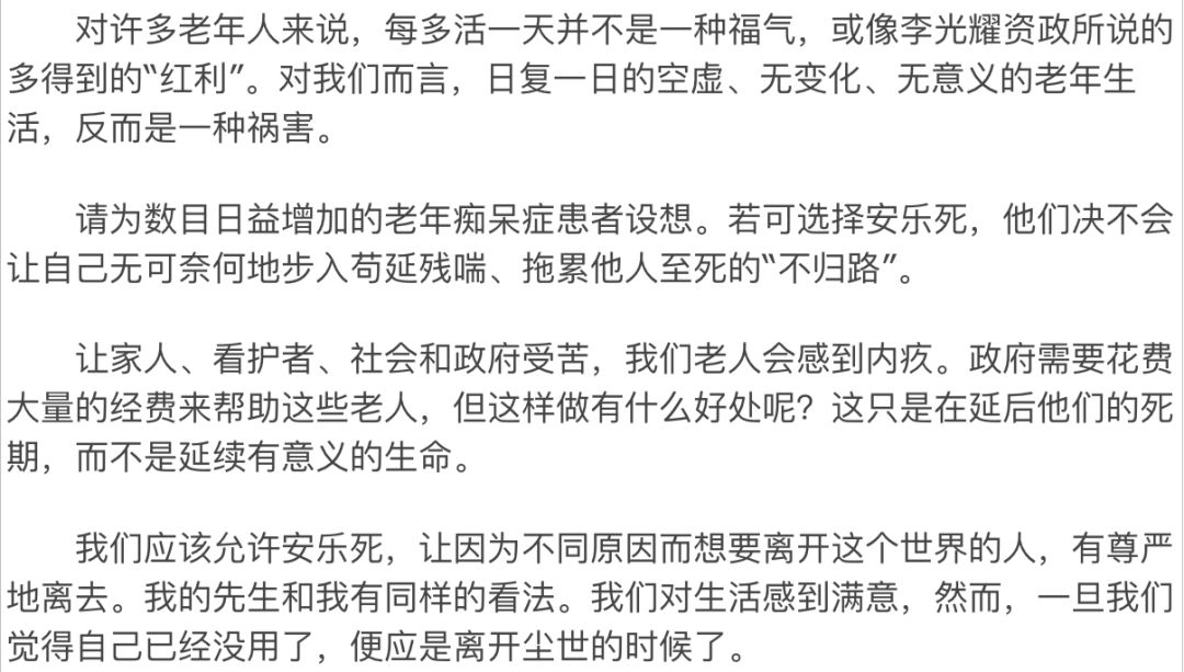 (2008年,72岁的沈李珍妮作为读者写信给联合早报,题目为《何不公开讨论“安乐死”是否可行?》,引起新加坡各界重视。)
