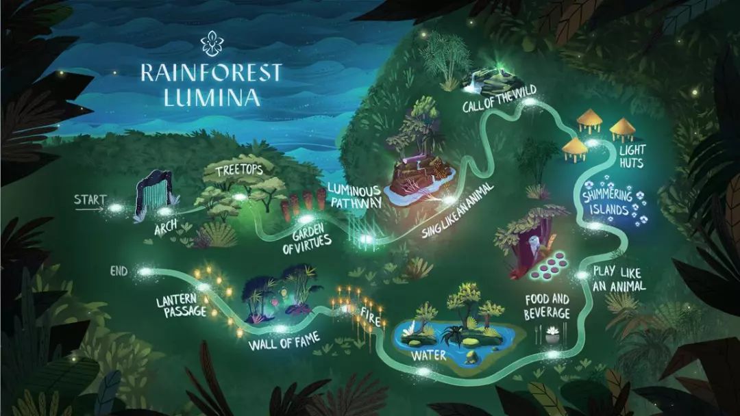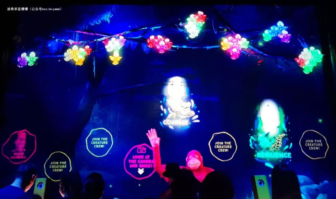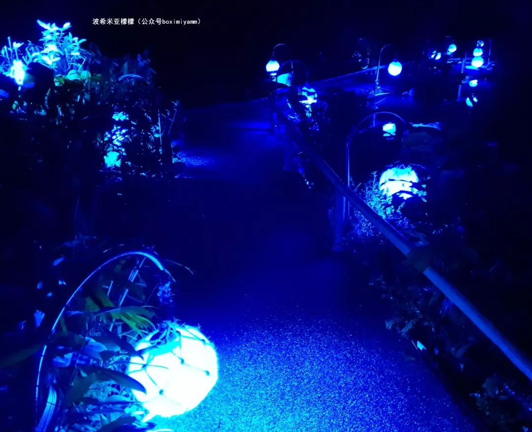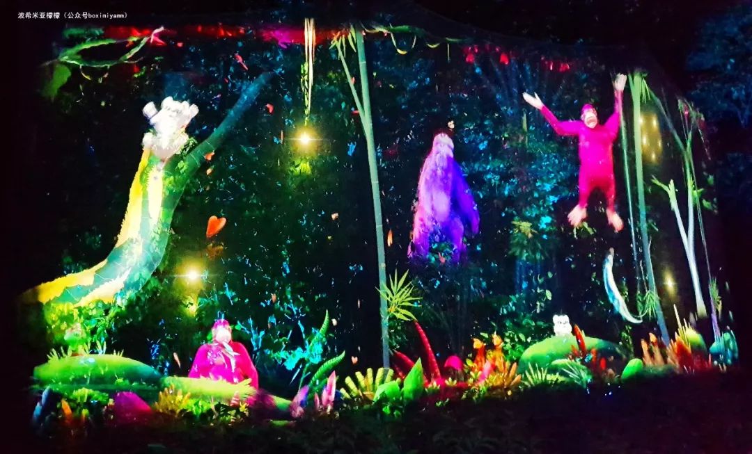 新加坡动物园Lumina Night Walk全长一公里,分为11个区域,多个观众体验项目,在本次的夜间展览中,动物都回到宿舍睡觉了,既不会影响动物的休息,所使用的发光技术,也不会影响到植物的正常生长。