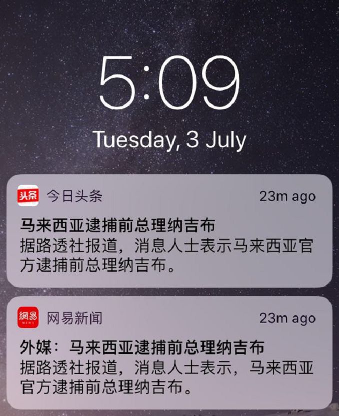 今天(7月3日)下午2点35分,马来西亚前首相纳吉被逮捕了。