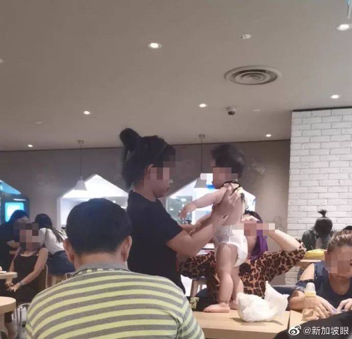 在新加坡餐厅桌子上,女子当众给宝宝换尿布