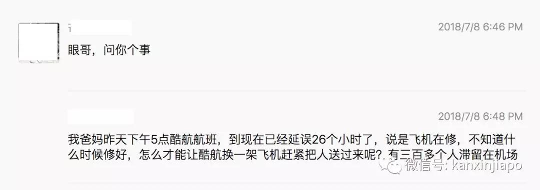 由于昨天取消航班的时候,酷航并未告知乘客具体原因,只说是飞机故障,且没有通知今天的航班起飞具体时间,乘客们都很焦急。网友说,他父母一夜都没休息好……