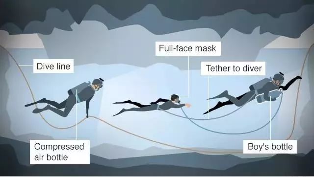 等待被救的孩子们在洞穴接受了潜水训练,在逃生过程中,他们每人由世界级的外国潜水员与泰国海豹队员,以2人护送1人方式进行。