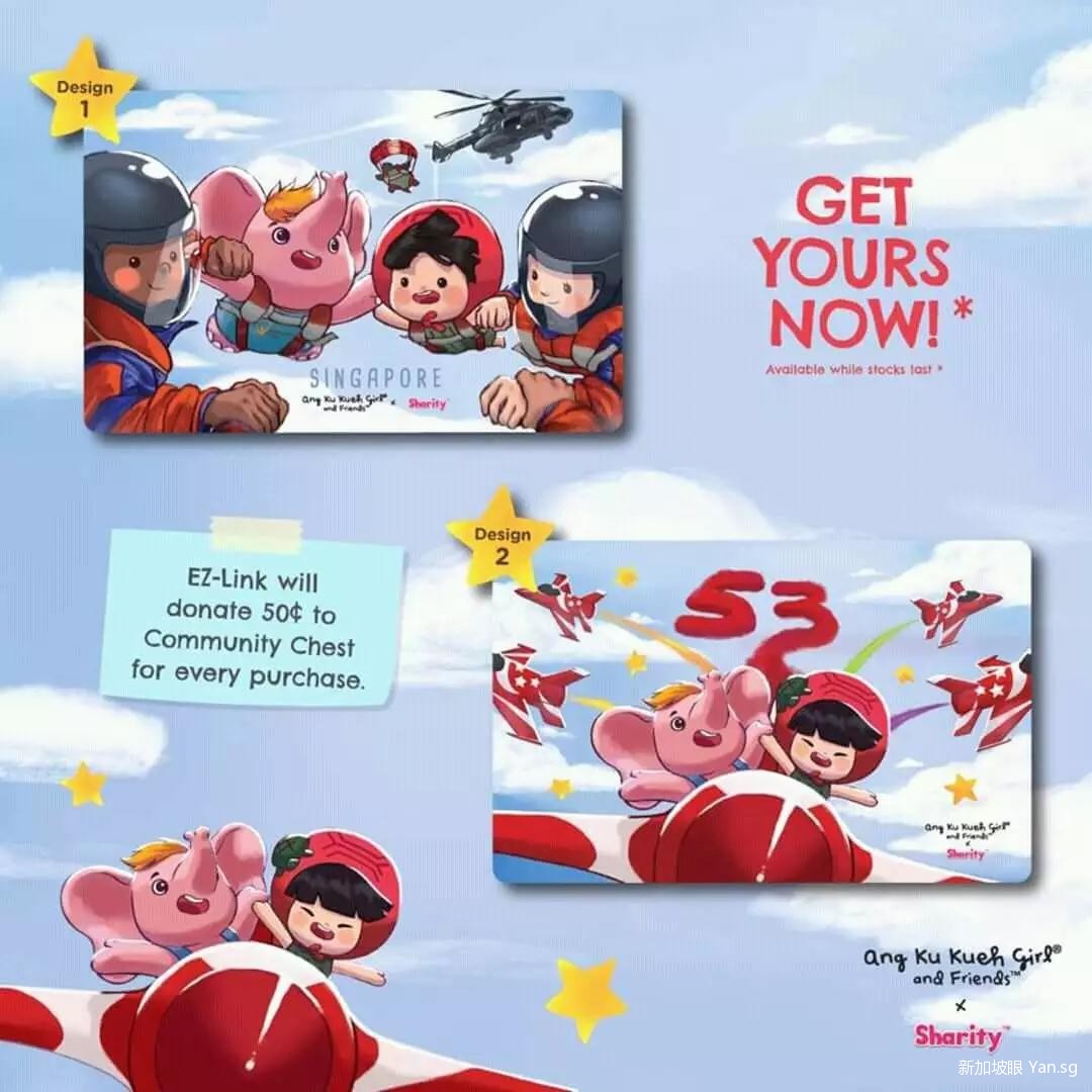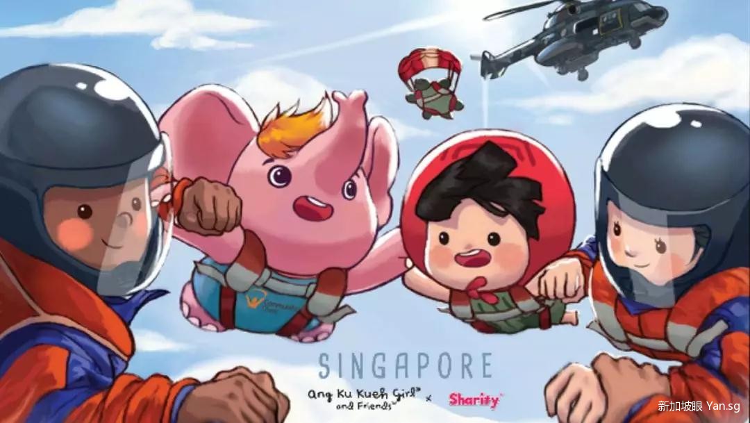 特别版国庆卡有两种设计,第一种设计是爱心小象(Sharity) 牵着红龟粿女孩 (Ang Ku Kueh Girl)和新加坡武装部队的红狮跳伞队一起在空中自由飞翔的有爱画面~ 看看这两个小可爱呆萌的小脸和兴奋的表情,简直萌化了老阿姨们的心啊~