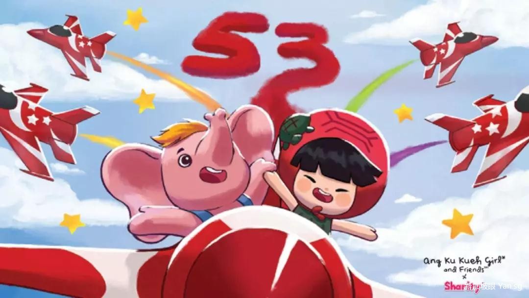 第二种设计是Sharity和红龟粿女孩骑在新加坡空军部队的黑骑士特技飞行队的战斗机上,空中还放射出53的红色烟雾,向全世界宣布,新加坡53岁啦!