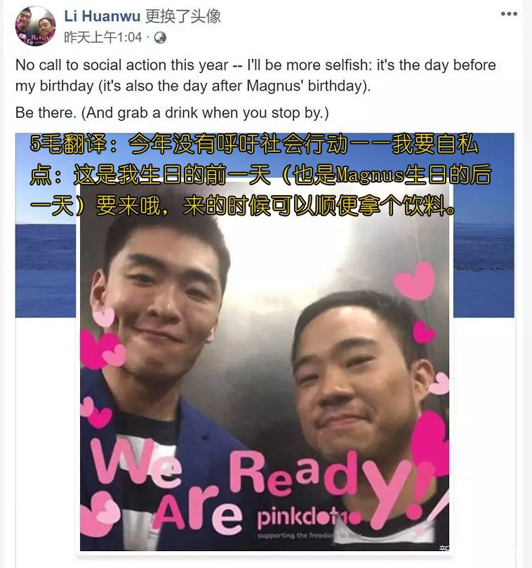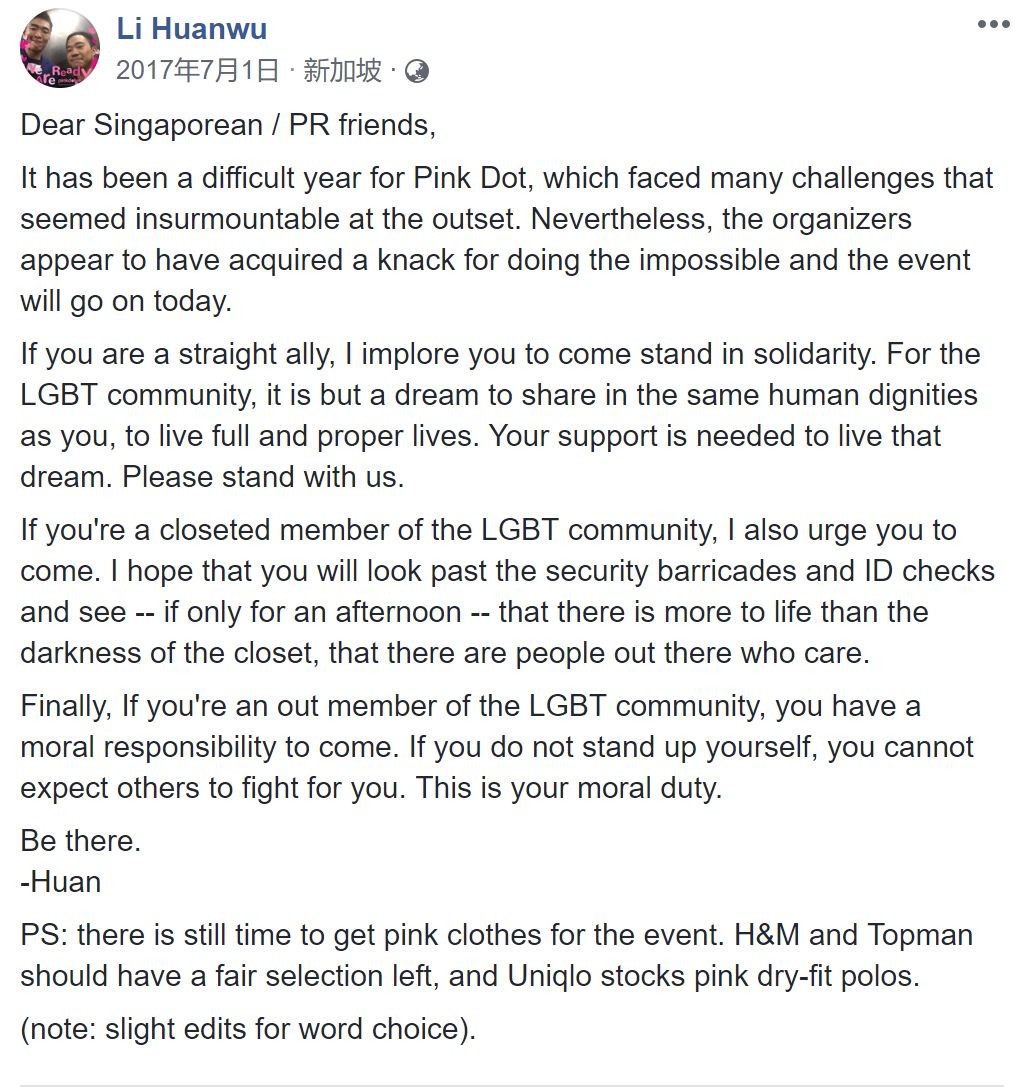 以前,他虽没有公开出柜,但一直都是Pink Dot的支持者。去年,还在Facebook上发长文公开呼吁大家支持LGBT群体并参加Pink Dot活动。