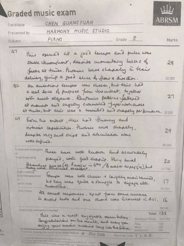 陈广源获得的八级证书以及LTCL演奏级证书,