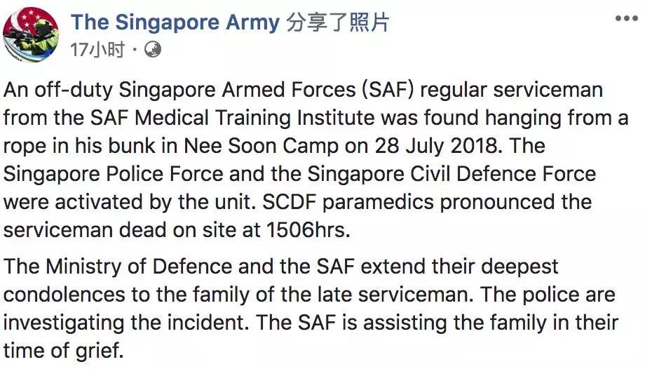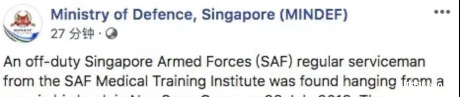昨天(7月28日),新加坡义顺军营中,武装部队医疗训练学院的一名正规军人被发现吊死!新加坡武装部队发布脸书,公布了这一沉重的消息…..
