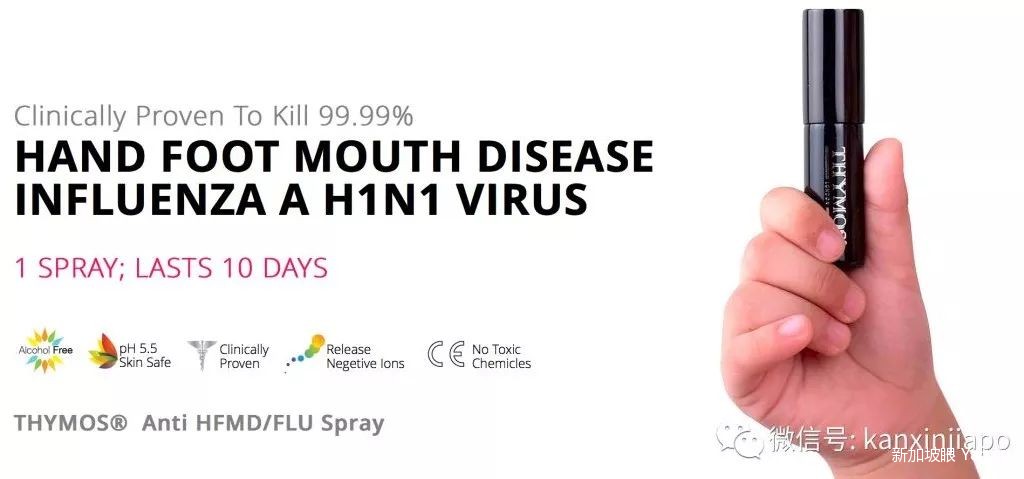 在新加坡手足口病来势汹汹时,邻国马来西亚也同样处于手足口病的高发季度。就在这时,一款名为Thymos的抗手足口病喷雾剂出现在了市面上,并宣称只需在衣物、玩具等表面喷雾,就能杀灭99.99%手足口病和流感病毒。