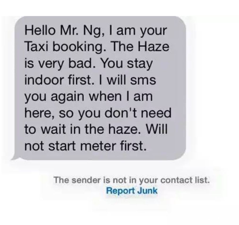 新加坡Facebook上,网友Josian坐的士时,室外有雾霾,收到司机超暖心短信,叫他先停留在室内,等司机到了,会再次短信他叫他出门,在这之前不会计费,以便他可以减少在雾霾环境停留的时间。