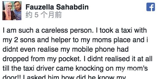 无独有偶,网友Fauzella将手机遗忘在车上,司机在乘客下车的组屋,挨家挨户询问失主。直到找到乘客家中,乘客才发现手机丢失,手机里有很多重要顾客的资料。