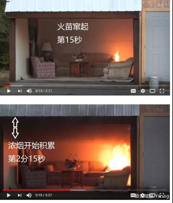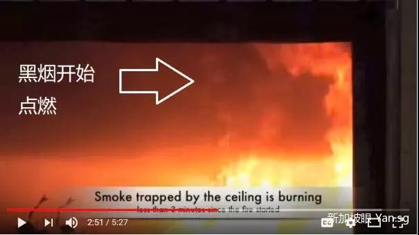 第2分15秒,黑烟开始在天花板处累积。这些黑烟是大量的碳燃烧不充分形成的一氧化碳,都是可燃物。不过在这时还没有达到点燃的临界温度。